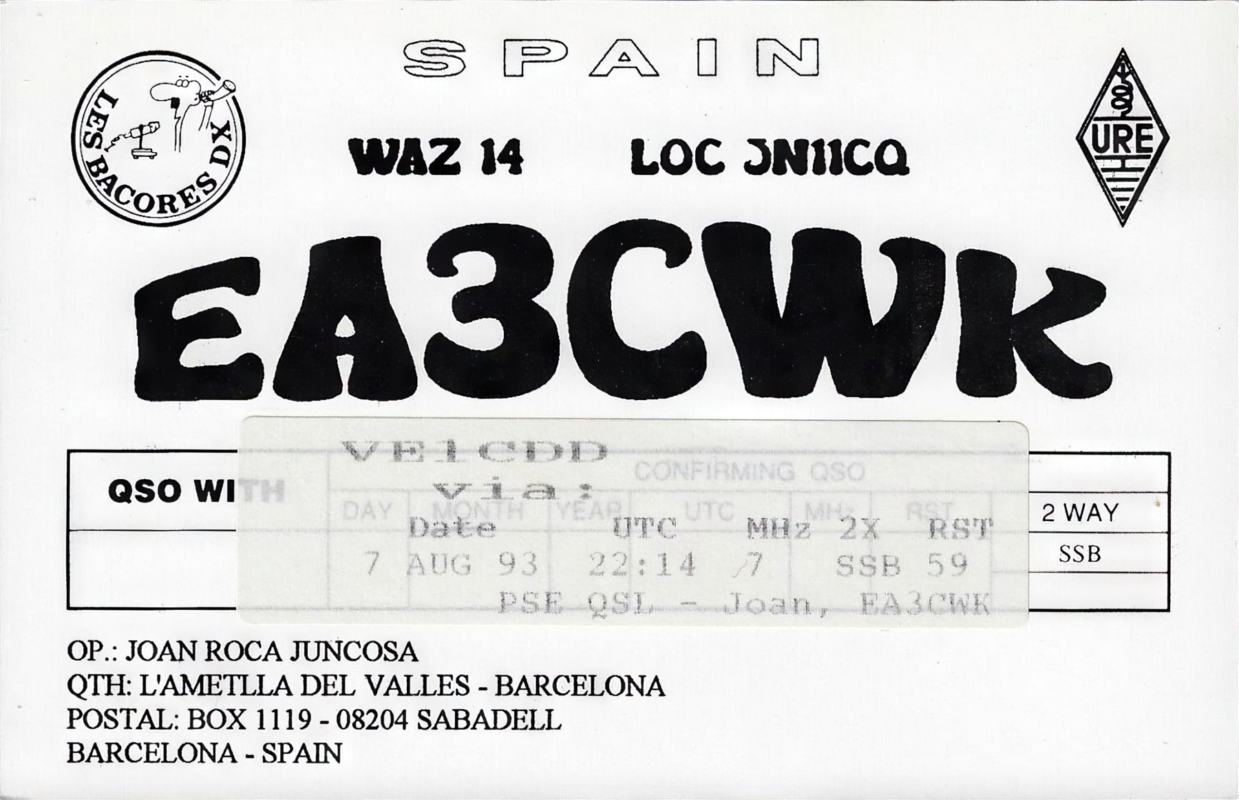 INDICATIVOS UTILIZADOS PROPIOS EC3CWK desde 06/07/90 hasta 14/07/91EF3CC en WPX – SSB 1991. Indicativo especial utilizado en este concurso. 30/31 de marzo de 1991EA3CWK desde 15/07/91 hasta 31/12/1996EA3II 1996AM3CWK & AM25CWK indicativos especiales utilizados durante la celebración de los Juegos Olímpicos de Barcelona en el año 1992EA4IG desde agosto 2023Recuperado mi indicativo EA3CWK desde 22…