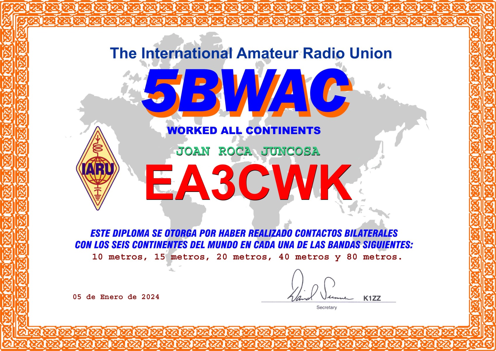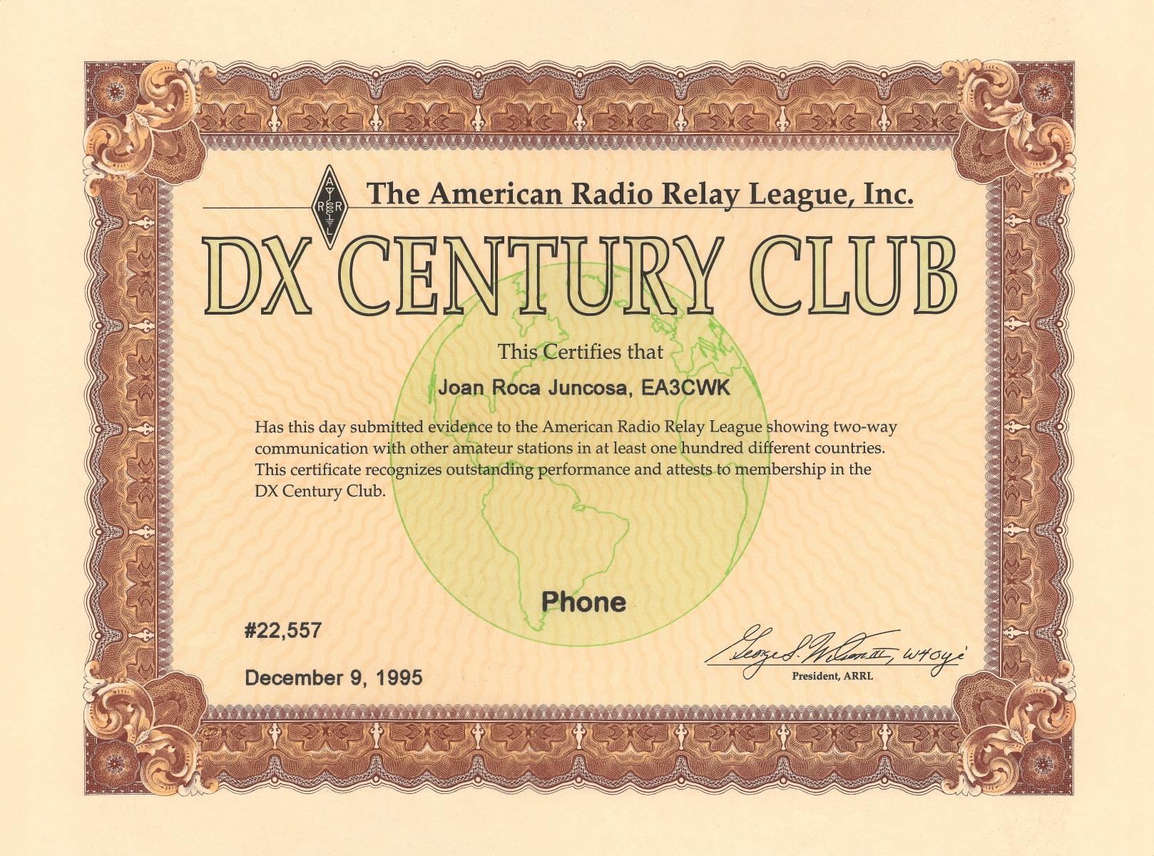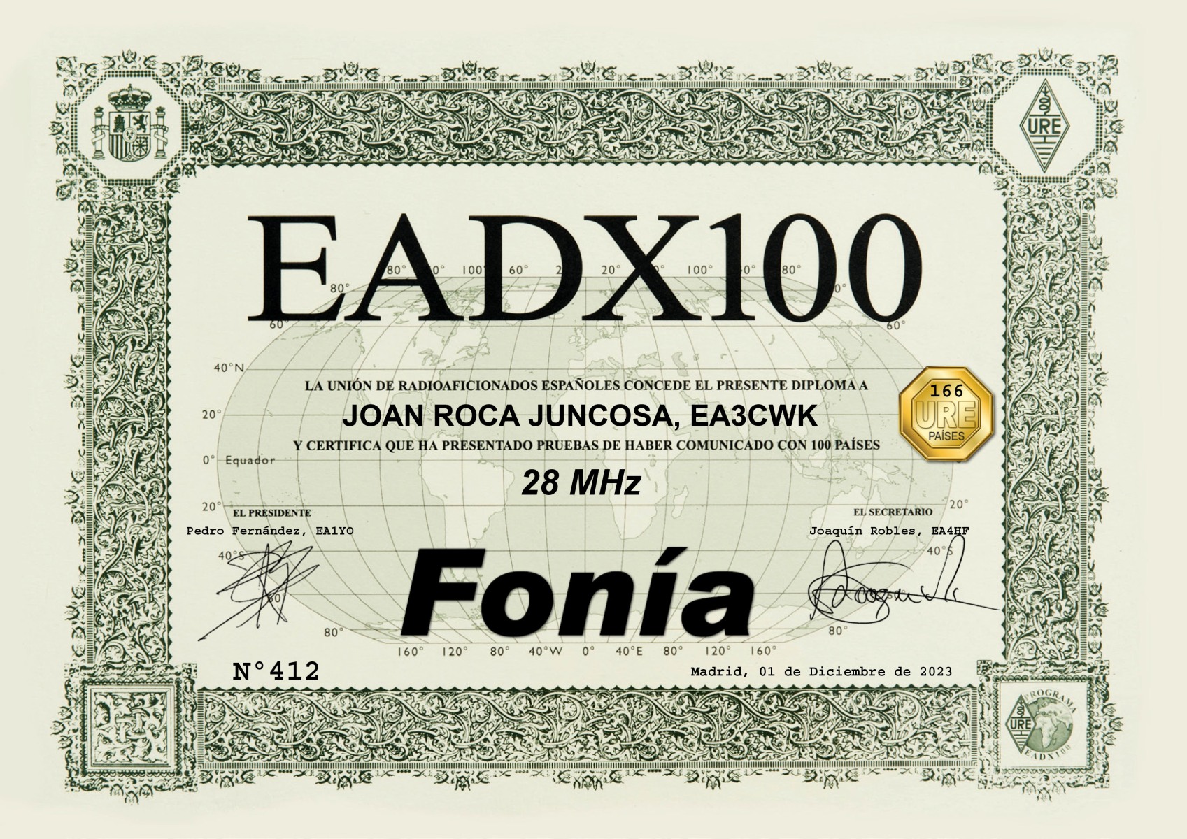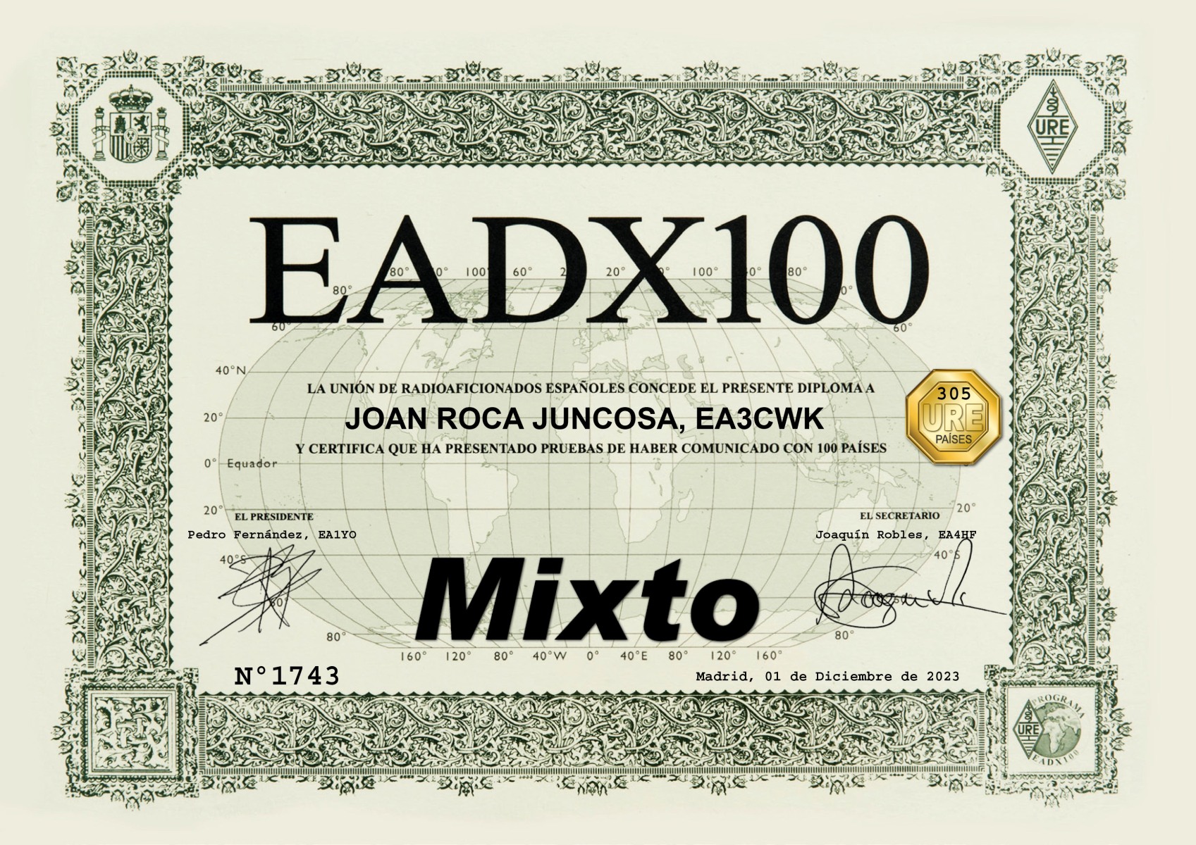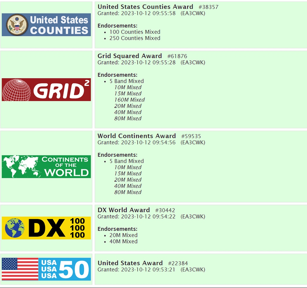 DXCC (número de diploma 34.581) – 316 países acreditados. Total actuales 308 países acreditados.