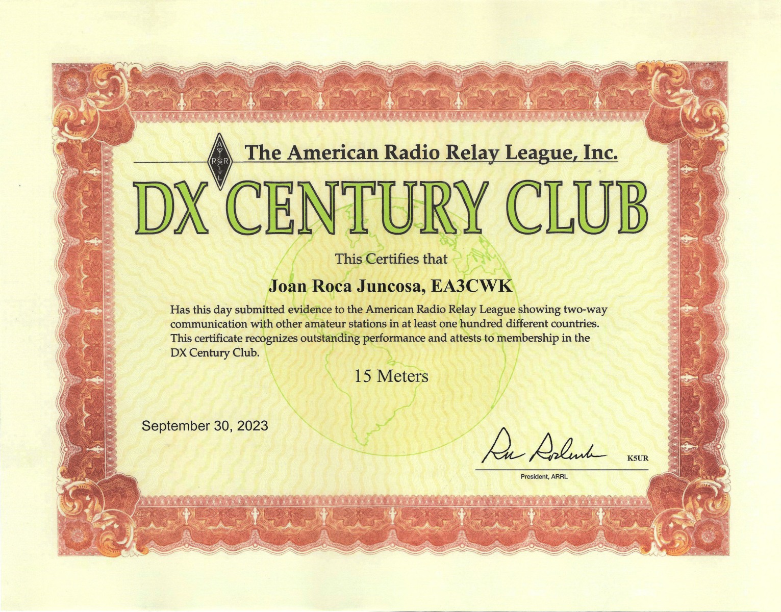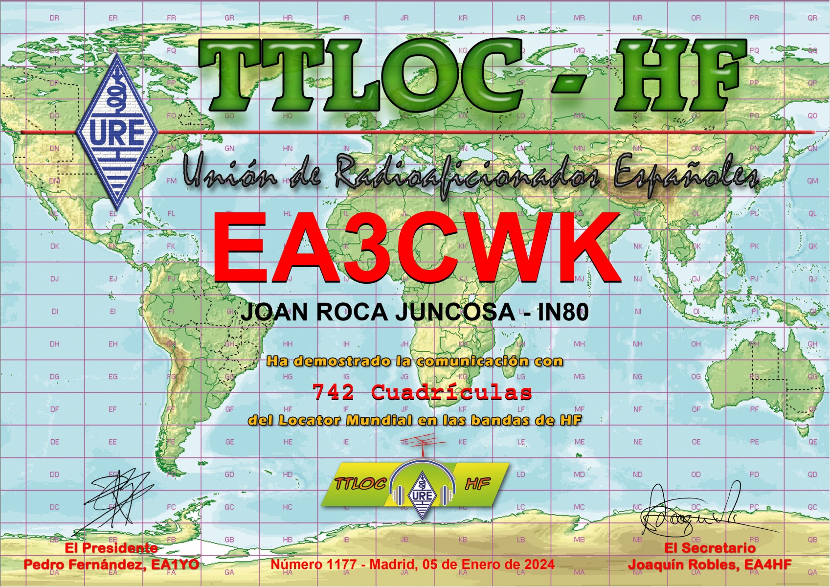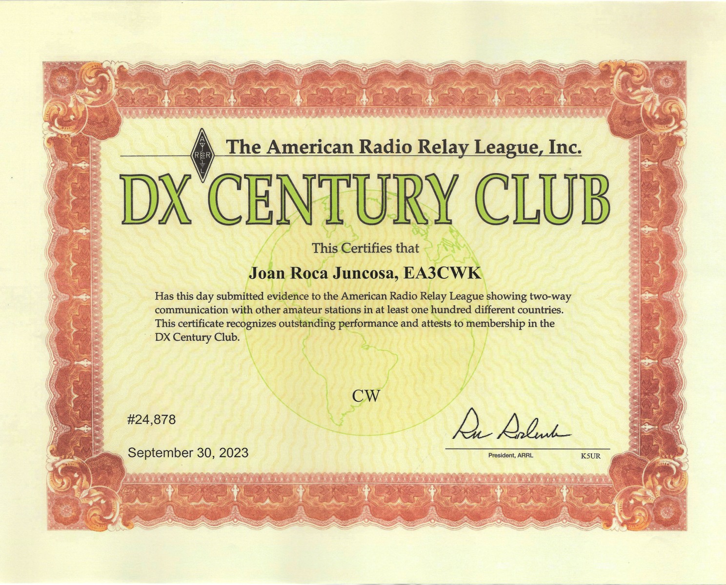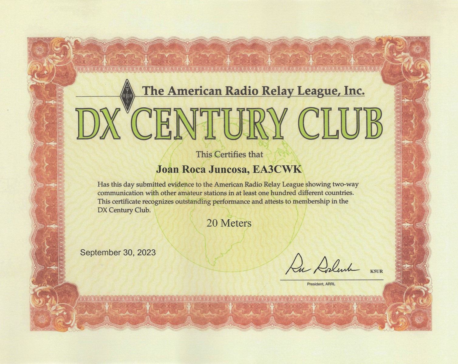 DXCC (número de diploma 34.581) – 316 países acreditados. Total actuales 308 países acreditados.