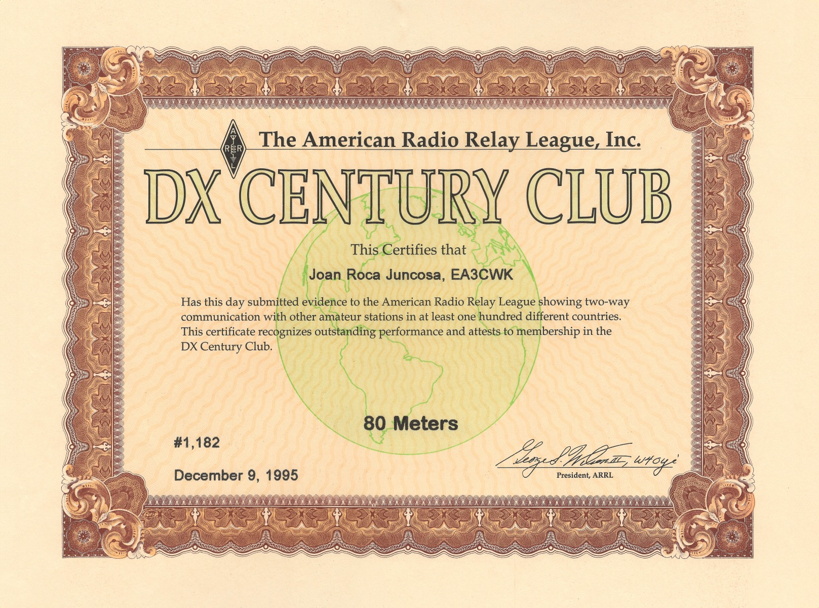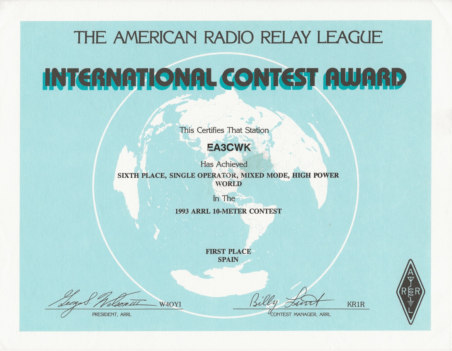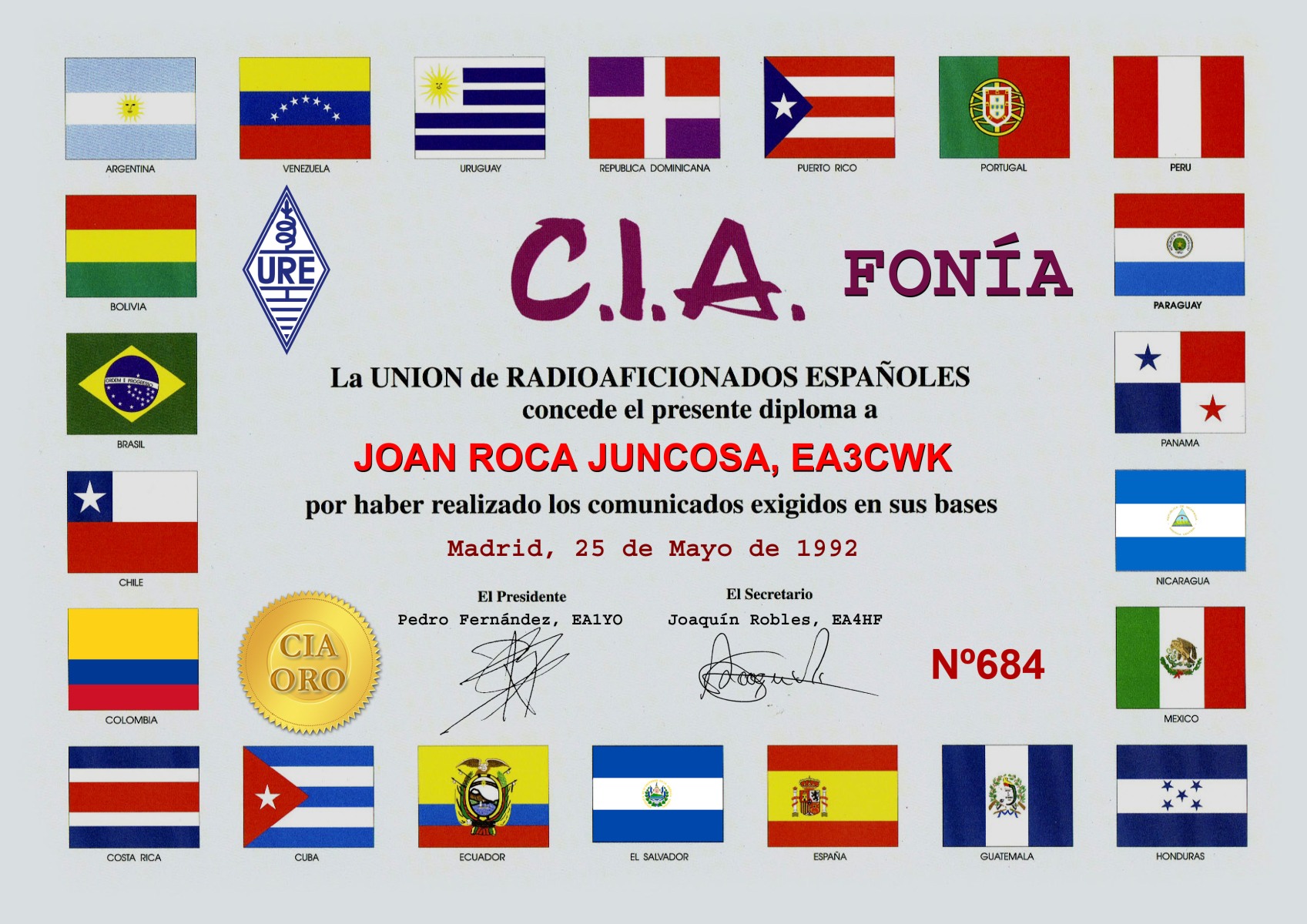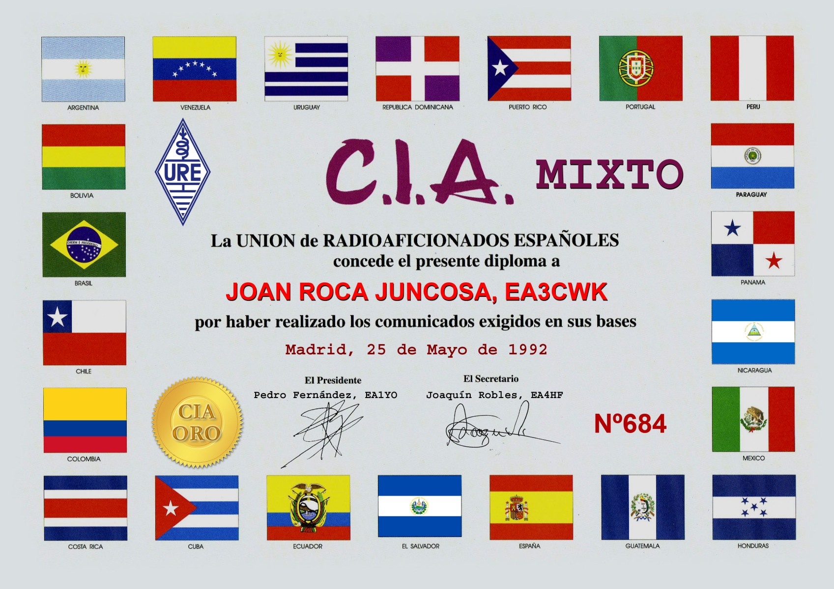 Miembro de Honor número 61 del Diamond DX Club de la Asociación de Radioaficionados Italiana, concedido en fecha 30 de Diciembre de 1992.