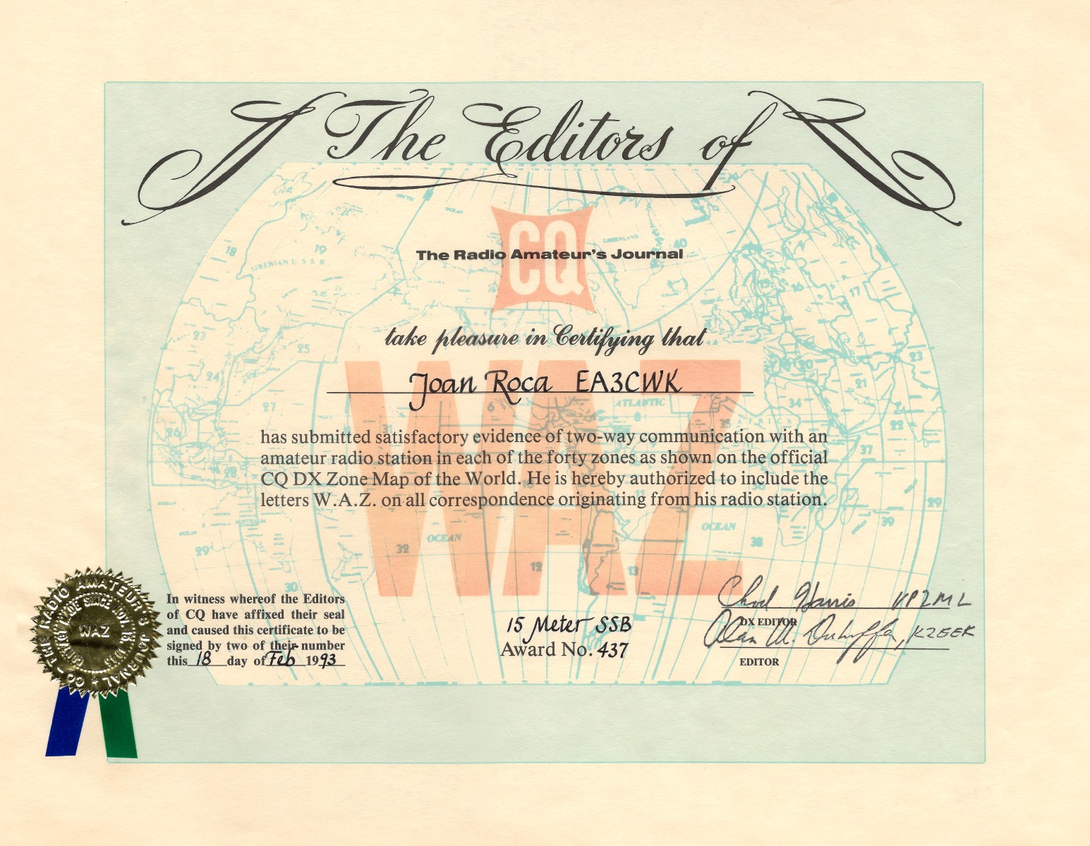 WAZ 15 metros SSB (número de diploma 437)