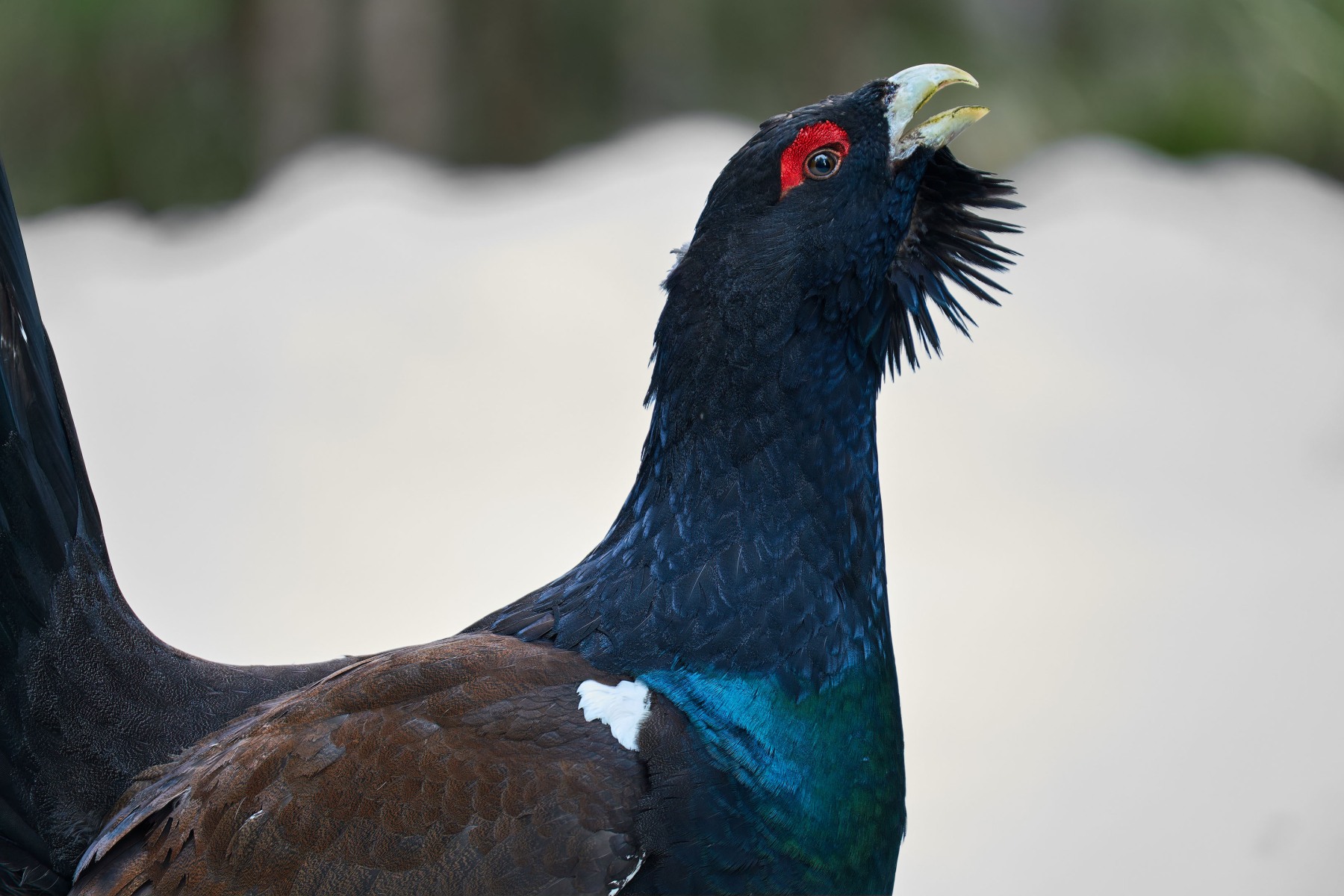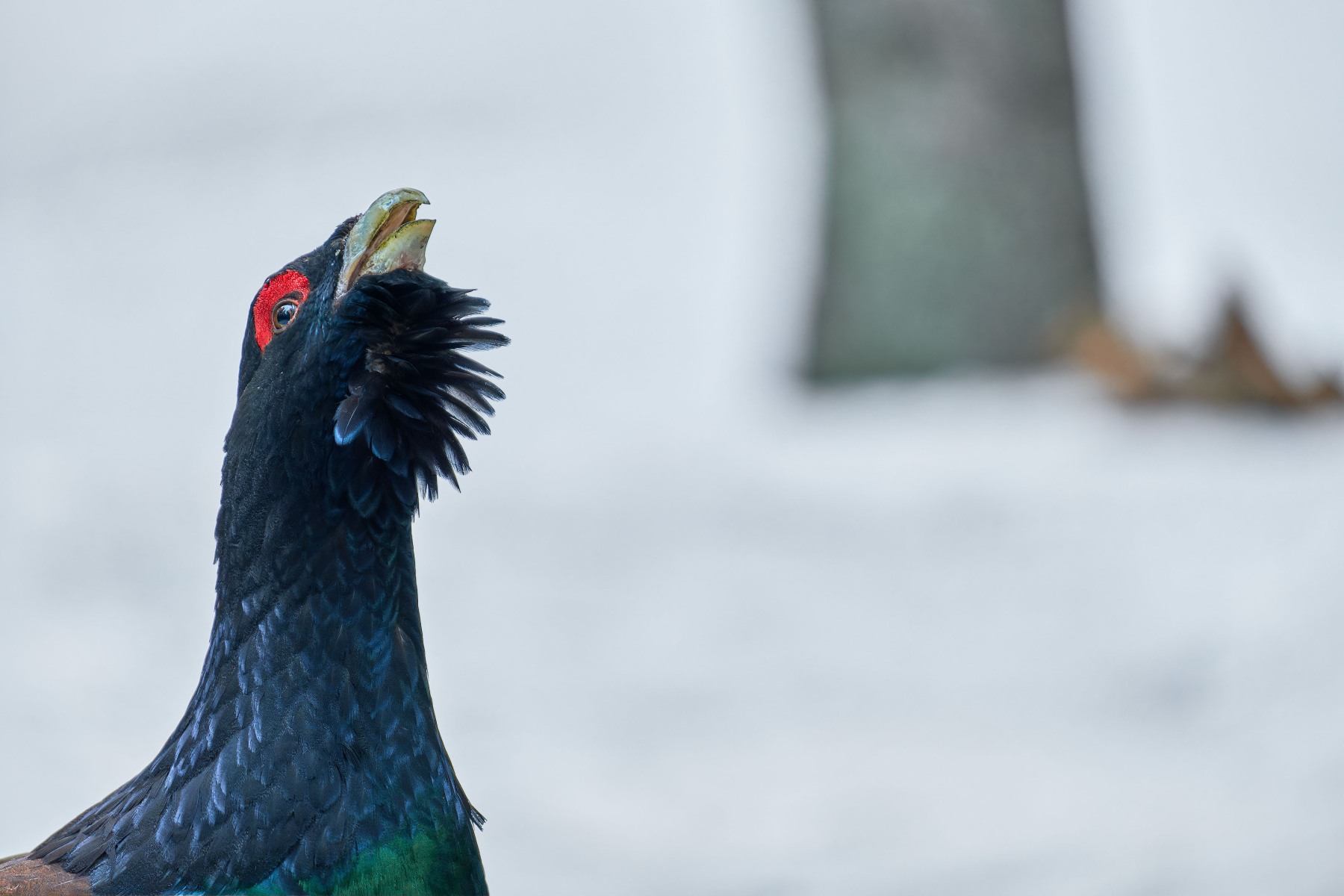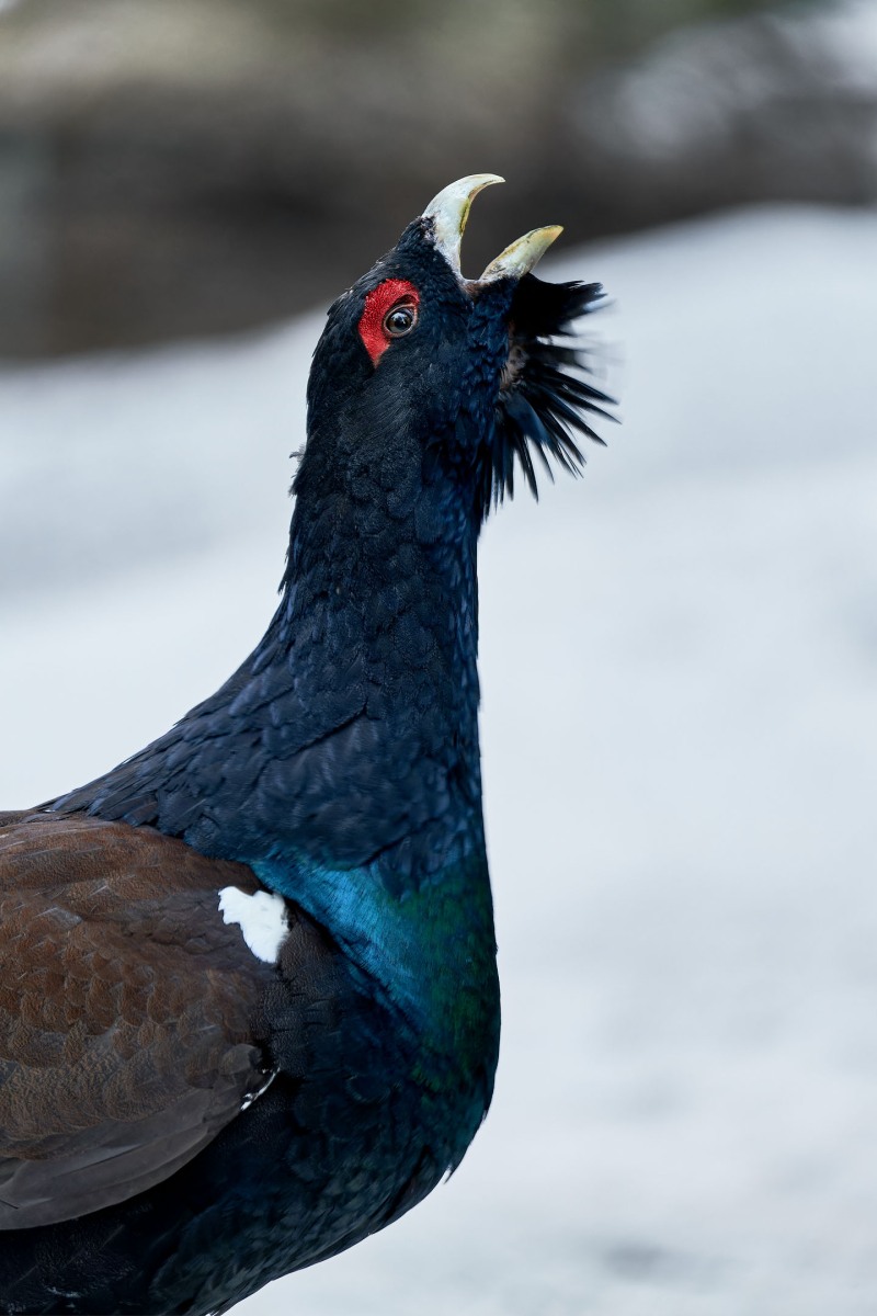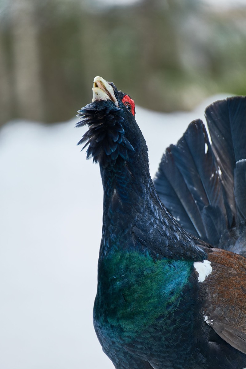 En la fase final de su estrofa, el urogallo macho se sumía en la sordera, desplegaba su majestuosa cola, estiraba su cuello y apuntaba su pico hacia el oscuro cielo. El frío ya no nos afectaba, nuestras ansias por capturar imágenes congeladas se intensificaban. A pesar de los desafiantes ajustes de ISO, alcanzando cifras inimaginables como ISO 12800, contamos con la bendición del poderoso software Pure RAW 3, capaz de transformar esas instantáneas en maravillosos tesoros visuales.